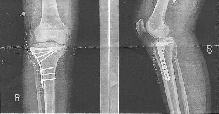 I had a tibial plateau fracture. Surgery with a plate and 10 screws to repair.