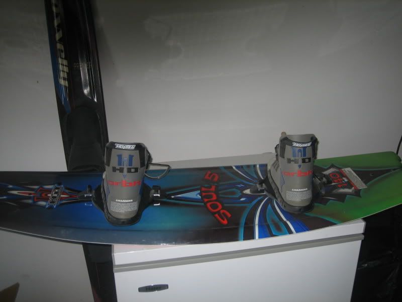 Like it says, 140cm Soul 5 board from 2004, complete with Orbit boots. This is a pretty nice board, I think it's geared mostly towards beginner to intermediate riders. It has a big fin on each end, about 1.75" I would guess, several big channels, and a big V down the center. It rides nice and stable, feels under control. I bought this board new in 2004, but was given another board that's a little bigger and suits me a little better. It's in nice shape, with one single nick/chip on one end. The board has some slight scuffs from being laid against another board or sitting on the swim deck, but it's never been slid. The boots are really nice, they are heavy duty construction with a single pull lace up and very comfortable footbeds. I just want to clean out the garage a little and this isn't getting used, so I'm trying to get $120 plus shipping out of it with the bindings on it. Here are a few pics, and I'll take more if anyone would like: